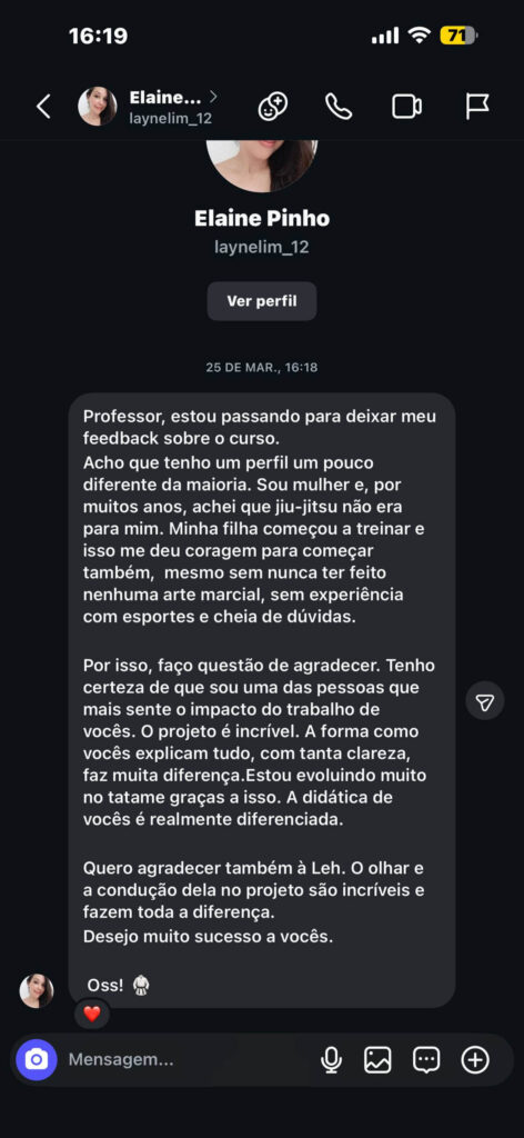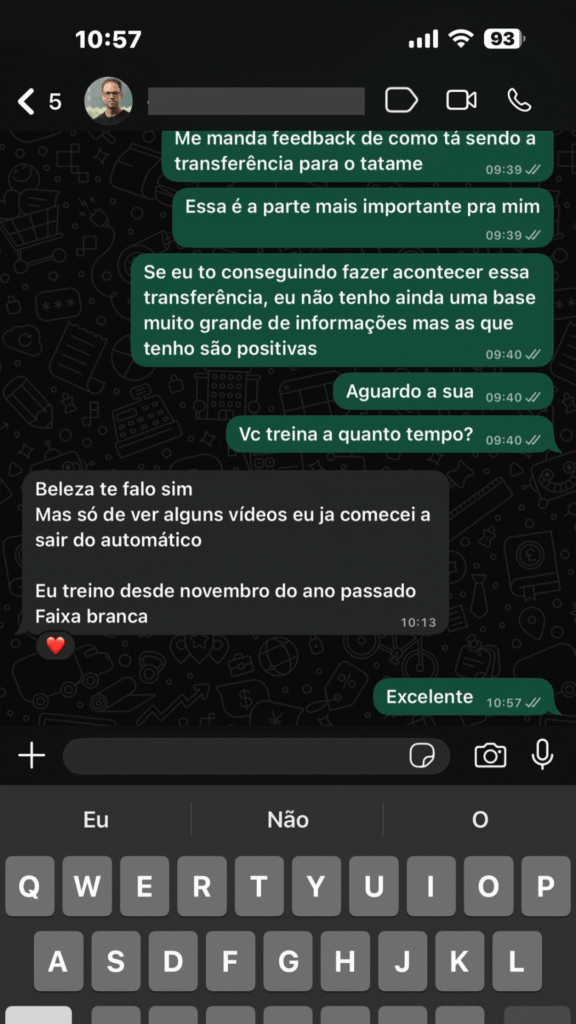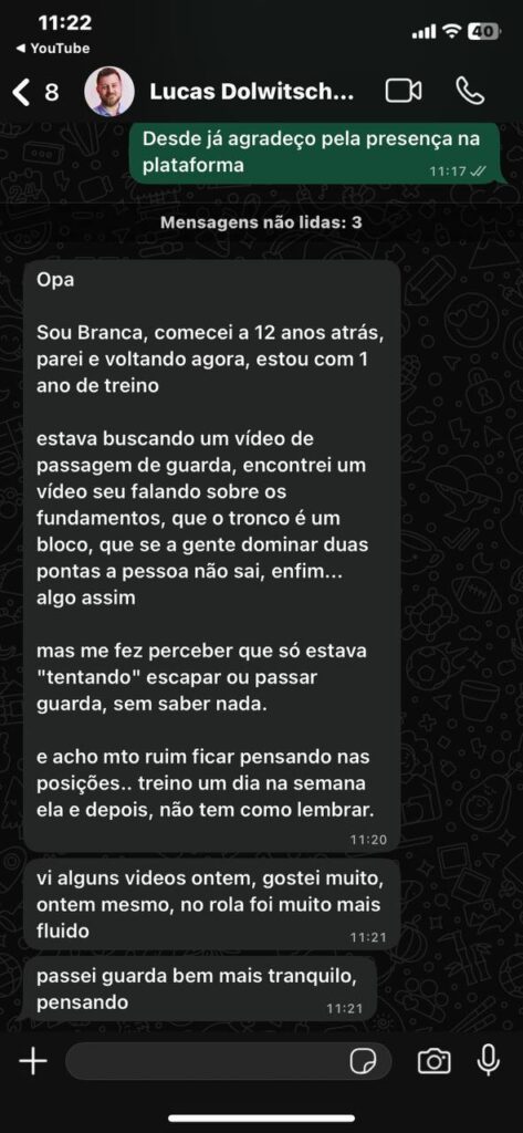 “..Sem querer entender porque eu mato o quadril, sem querer entender porque que eu passo a linha do joelho. Eu não atingiria o nível que eu tenho hoje. não atingiria. Não tem como porque acaba que o jiu jitsu é tecnologia”